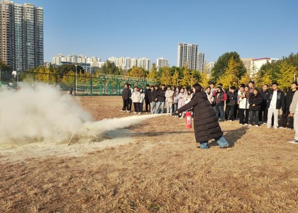 实操演练环节是此次活动的核心内容。在篮球场南侧空地演练场,工作人员点燃了废弃物火堆,熊熊燃烧的烈火让大家真实感受到水火无情。随后师生轮流上阵,相互配合,亲身体验使用灭火器扑灭模拟火点,大家在实践中不断总结经验,切实掌握了操作技能。