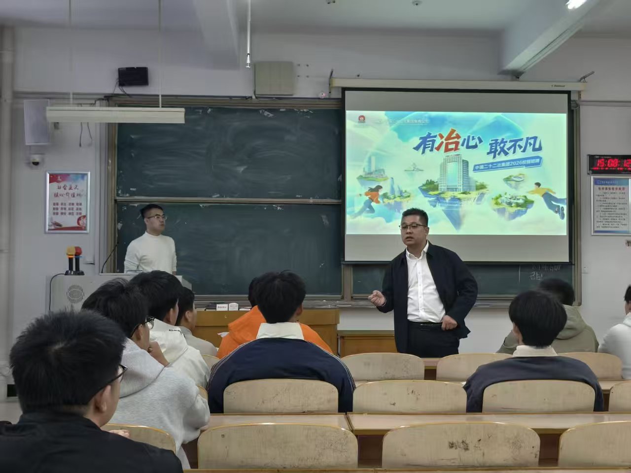 讲座特邀中国二十二冶集团有限公司代表姚德建(2007届工程管理专业毕业生,现任职中国二十二冶集团广东公司总经理助理),为同学们介绍企业发展平台及岗位需求。作为以工程总承包、城市更新、技术装备制造等为主营业务的大型综合企业,中国二十二冶近年来持续推动“两步走、两跨越、两翻番”战略,实现了规模与质量的双重跃升。企业代表详细说明了薪资待遇、区域布局及招聘要求,帮助学生充分把握就业机遇。