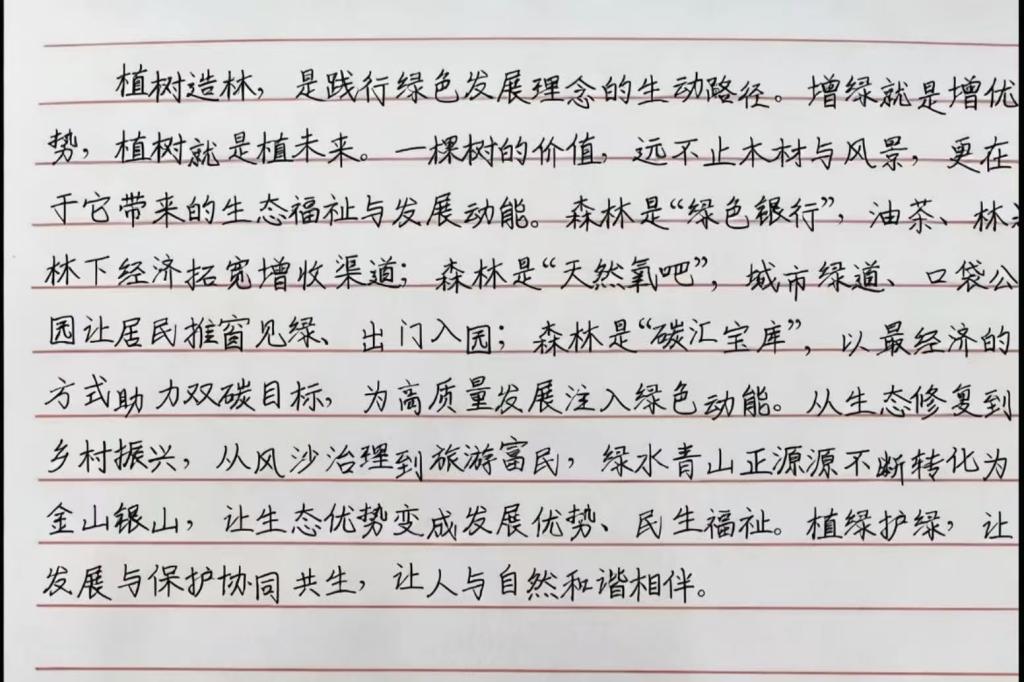 活动期间,同学们紧扣主题,创作的参赛作品体裁丰富,包含散文、诗歌、纪实类文章等多种形式,或描绘植树造林的生动场景,或抒发对绿水青山的热爱,或讲述身边的环保故事,用细腻的笔触传递着“绿水青山就是金山银山”的生态理念。最后,经过评委的严格评审,段晓童获得一等奖,赵倩颖、王歆然获得二等奖,陈佳、艾子涵、孟欣欣获得三等奖。